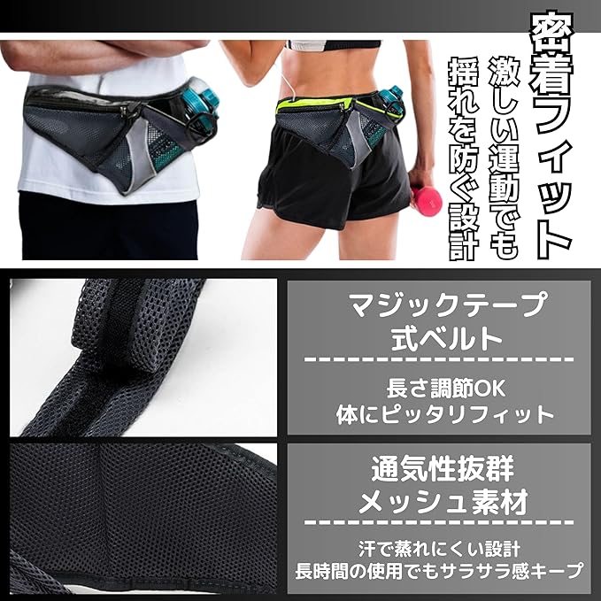 【揺れを防ぐ設計】調整可能なベルトが体にピッタリフィット。ランニング、ジョギング、ウォーキング中も揺れにくく、快適に運動をサポート。
