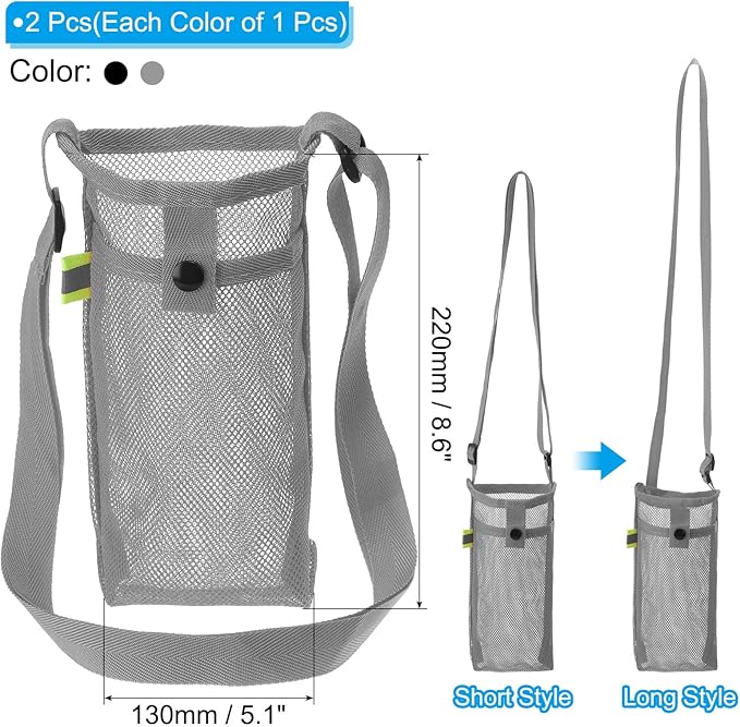 PATIKIL 22mmx13 mm ウォーターボトルバッグ 2個セット メッシュポータブルボトルホルダーキャリア スポーツ ハイキング キャンプ用 調整可能なショルダーストラップ 黒グレー | KAZESHOP