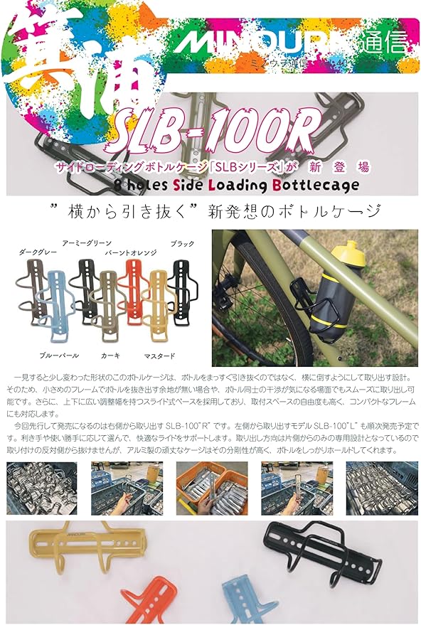 ・サイドローディングボトルケージ ・SLB-100R(右抜きタイプ) ・ブルーパール ・ボトルをまっすぐ引き抜くのでは無く、横に倒すようにして取り出す設計。 小さめのフレームでボトルを抜き出す余地が無い場合やボトル同士の干渉が気になる場面でもスムーズに取り出し可能。