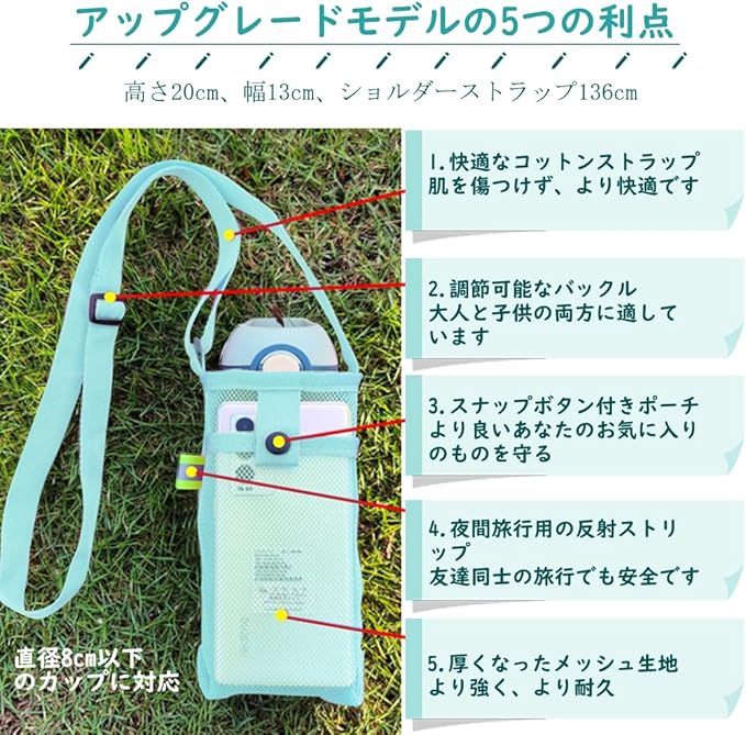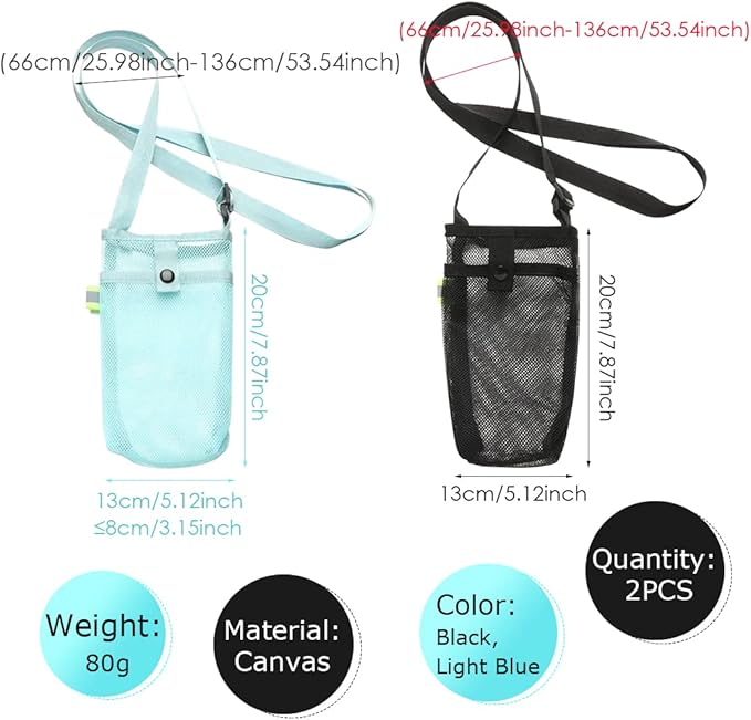 ♡メッシュボトルスリーブのサイズは20 x 13 cmです。直径8cmのボトル使用に適した、ウォーターボトル全体を簡単に包むことができ、使用しないときはスペースを取りすぎずに保管するのに便利です。
