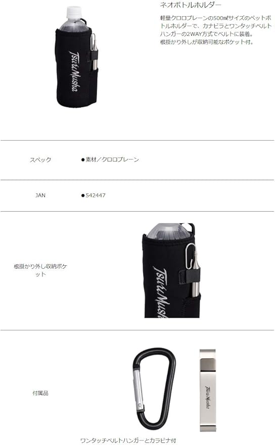 500mlペットボトル対応の軽量クロロプレーンペットボトルホルダー。 カラビナとワンタッチベルトハンガーの2WAY仕様でベルトやロッドケースに装着可能。