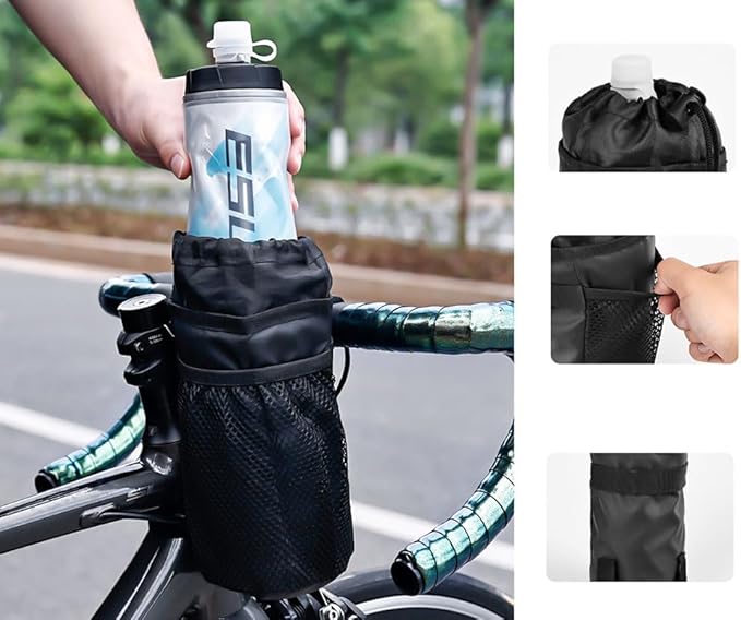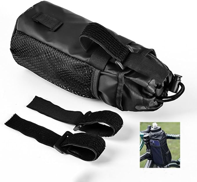 【簡単に取り付け】伸縮性のあるドローコードを閉じることでボトルを所定の位置に保ちます。工具不要-ボトルホルダーは組み立てが非常に簡単です。ストラップで自転車のハンドルバーに取り付けられています。ハンドルバーに簡単に取り付けられる調節可能なストラップです。