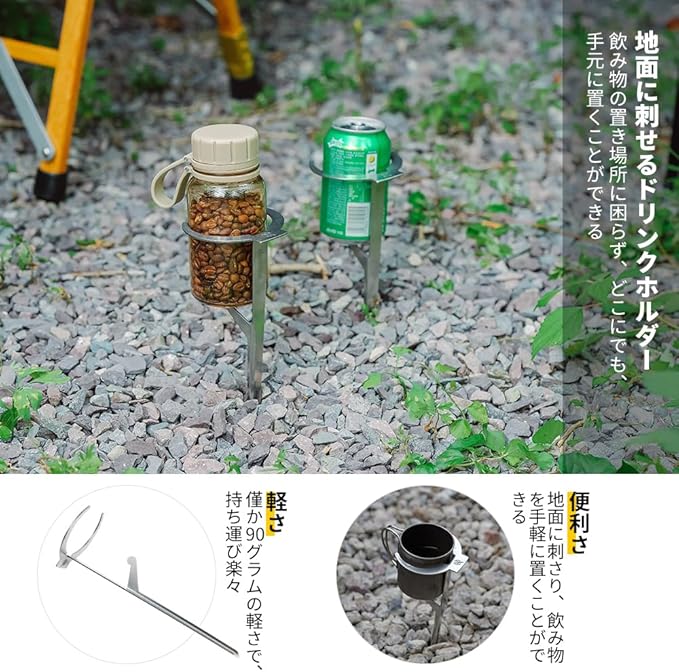 便利さ:地面に刺さり、飲み物を手軽に置くことができ、様々な地面に対応できて、硬い地面や砂地、草地など、ビーチにも食い込むことができて、どこにでも、飲み物を置くことができます。