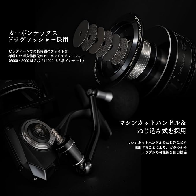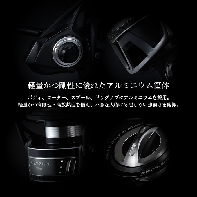 搭載機能: 「アルミニウムボディ」「アルミニウム製ローター」「高剛性ステンレス素材ドライブシャフト、ドライブギア、ピニオンギア採用」「ねじ込み式&マシンカットハンドル」「アルミマシンカットドラグノブ」「ステンレススチール ボールベアリング搭載」「マニュアルリターン採用(※手動でのベール開閉)」「ハイギア(HGX)モデル」