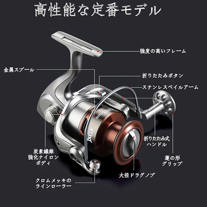 【高品質リール】リールのボディーは炭素繊維強化ナイロンを採用して、強度を伴った軽さがあって、耐久性に優れています。オールメタルの精密彫刻ラインカップ、スリムな流線型デザインのボディ、美しく装飾された、滑らかな動き、完璧なフィッシングツールです。