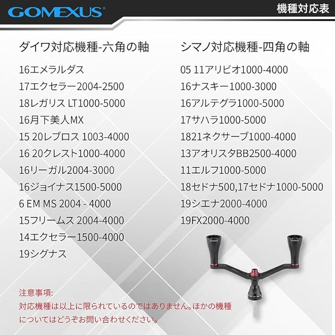 ダイワの対応機種(六角の軸のハンドルにしてください) : 16 エメラルダス ; 17 エクセラー 2004 - 2500 , 18 レガリス LT 1000 - 5000 , 16 月下美人 MX , 15 レブロス 1003 - 4000 , 16 クレスト 1000 - 4000 , 16 リーガル 2004 - 3000 , 16 ジョイナス 1500 - 5000 , 16 EM MS 2004 - 4000 , 15 フリームス 2004 - 4000 , 14 エクセラー 1500 - 4000 , 19シグナスなど供回り式リール