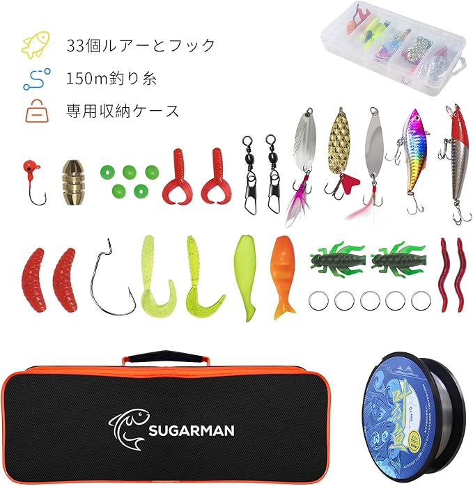 【コスパ最高】セット内容も充実していますし、ワームと針など豊富なルアーと釣りフック 、150Mの釣り糸が付きます。釣り糸を簡単に巻上がれるし、組立と分解もしやすい。収納バッグはナイロン製なので、防水面でも優れており軽くて丈夫です。