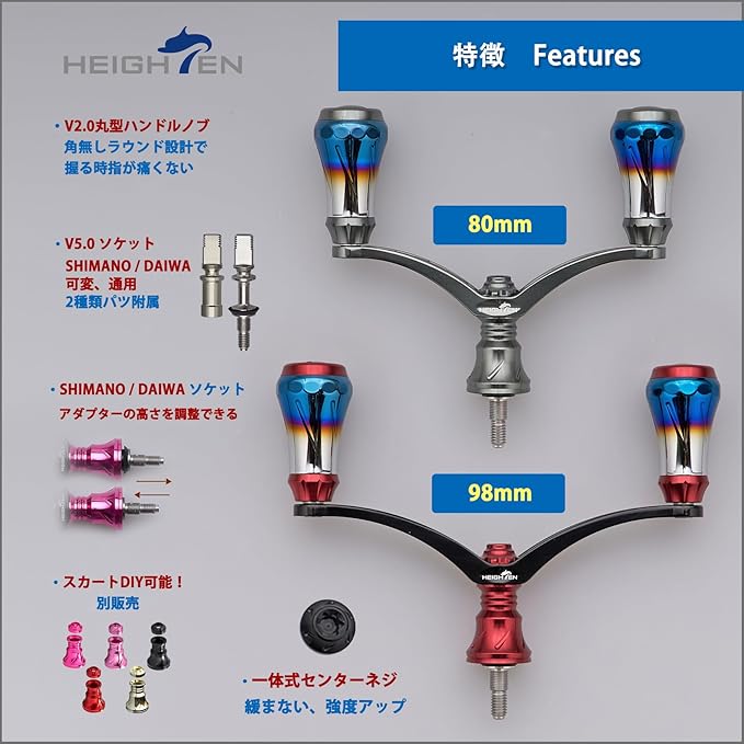 【サイズ】ハンドル軸心距離98mm、V2.0新型ノブ直径20mm 【総重V4.0-98mm】33g(ダイワ用) / 37.5g(シマノ用)【総重V4.0-80mm】29g(ダイワ用) / 33.5g(シマノ用)【総重V3.0-98mm】39g(ダイワ用) / 44.5g(シマノ用)【素材】航空アルミ。
