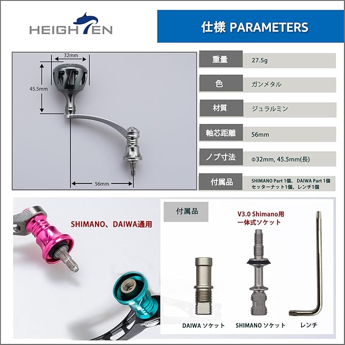 【サイズ】ハンドル軸心距離56mm、ノブ直径32mm【総重】27.5g【素材】70シリーズ航空アルミ。