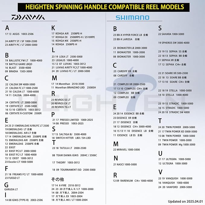 【特徴】軸芯距離45-50mm可変ハンドル、焼き色 20mmアルミ製 6.8g軽量ノブ搭載、軽くて強度高い。 【サイズ】ハンドル軸心距離45-50mm可変、ノブ直径20mm【総重】24g (ダイワ用)/28.5g(シマノ用)【素材】70シリーズ航空アルミ。 【リールハンドル付属】DAIWA ソケット 1個、SHIMANO ソケット 1個、レンチ1個。 【対応機種】DAIWA、SHIMANO ネジ込み式 スピニングリール 。 【保証期間】:60日(付属を除く)保障付き、60日以内無条件返品交換できます。リールハンドルの交換可能対応機種は以下の説明限りではありませんので、何か問題がございましたら、メールでご連絡おねがいいたします。