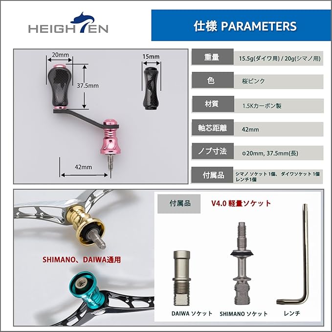 【サイズ】ハンドル軸心距離42mm、ノブ20mm/21mm(幅)x15mm(厚) 【総重】20g(シマノ用)/15.5g/(ダイワ用)【素材】ハンドル - 1.5K炭素布のカーボン。