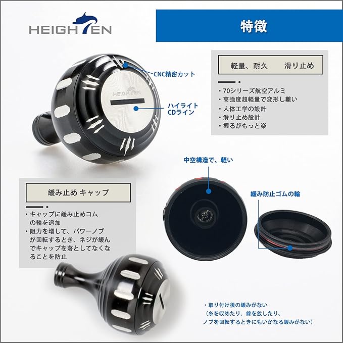 【商品特性】:綺麗な外観、高性能素材、CNC精密加工技術,丈夫で軽い、耐海水、耐腐食、錆付かない、耐久性、安定回転、滑り止め設計、キャップ緩み止め設計、コントロール性能上がり、人体工学設計で疲れない。