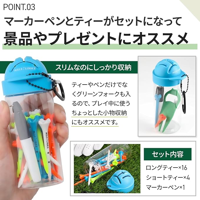 ゴルフティー収納ボトル&ラインマーカー ゴルフラウンドに必携の便利アイテム! セット内容 ・ゴルフティー収納ボトル ・ラインマーカー機能付きキャップ ・ゴルフティー ロングティー 16本 ショートティー 4本 ・ライン描き用ペン