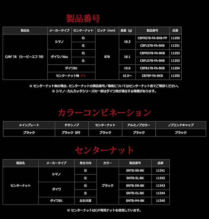 コンセプト:【C/BF 78+Fino Air】……"強度"と"軽さ"という相反する部分を徹底的に追求し、軽い操作性と高感度を実現させたベイトフィネスダブルハンドル! 最軽量化された"チタンノブ「Fino Air」"&"C/BF専用センターナット"を採用し、最軽量モデルはわずか「18.1g」を実現!