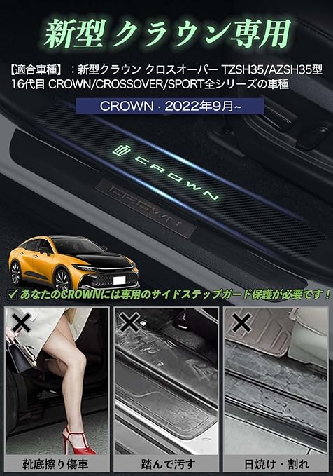 [対応車種]:適合クラウン35系 スカッフプレート 16代目 CROWN CROSSOVER TZSH35 AZSH35 (2022年9月~現行)。ご注意ください:護板を正しく取り付け、確実に固定しておくことで、走行中に緩むことがないようにしてください。定期的に護板を清掃して、その夜光効果と外観を維持してください。【パッケージ内容】車用 サイドステップガード*4、日本語取扱説明書*1