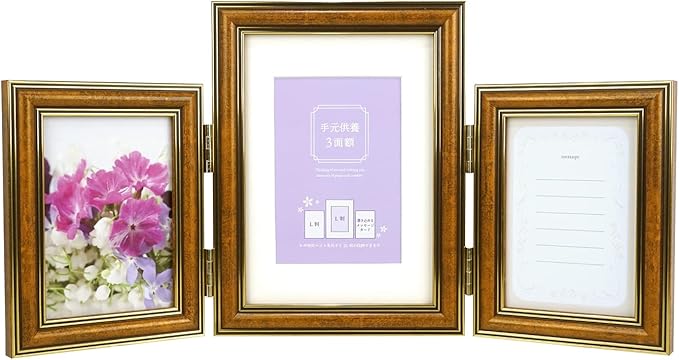 【手元供養3面額】本体:樹脂製 面材:樹脂 対応サイズ:L判/2L判 外寸:402 208 17mm(見開き時) 内寸:[中央]127 78mm[左右]89 178mm