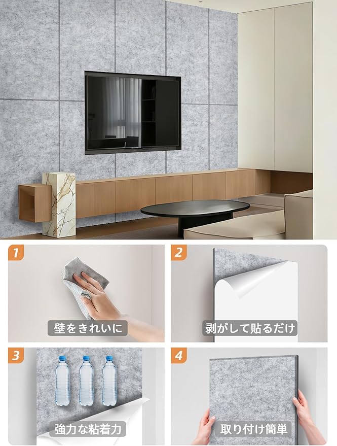[強力粘着で貼るだけの簡単施工、面倒な準備は不要]裏面に加工された強力粘着テープで、剥離紙をはがして貼るだけ。面倒な工具や準備は一切必要なく、防音パネル施工をぐんと簡単にしました。ウォールパネルとして、ご自身のタイミングで素早く取り組めます