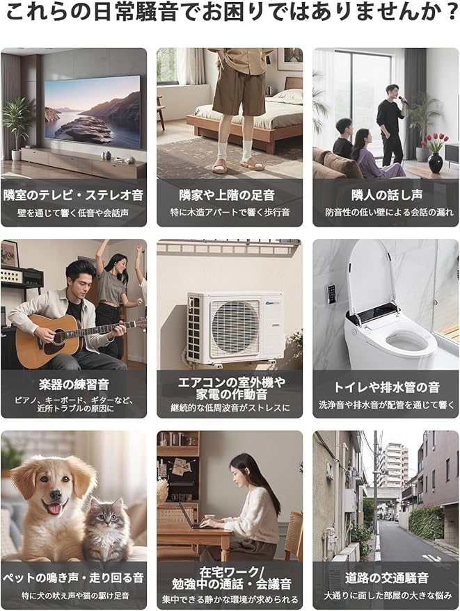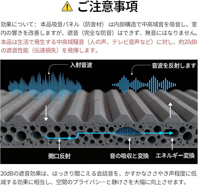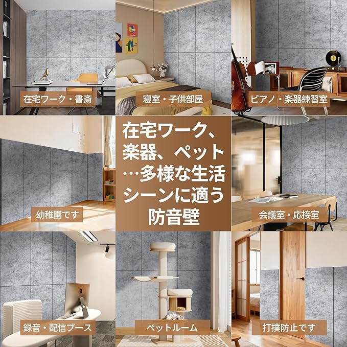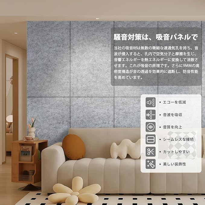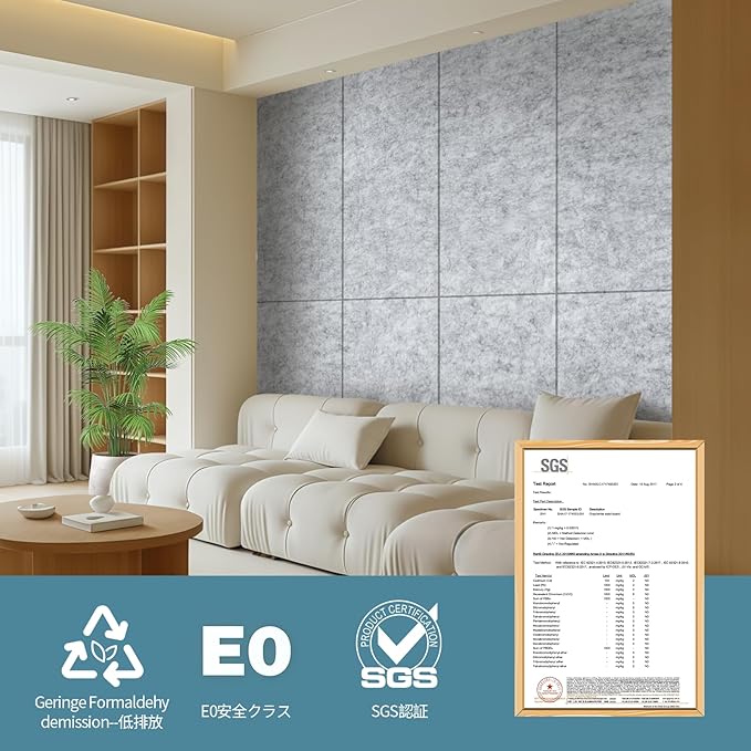 [高密度PET防音材で、騒音を効率的に吸音・低減]環境に優しい高密度PET防音材(密度1.6kg/㎡)を採用。中高周波数の音を効果的に吸音し、遮音性で外部への音漏れも軽減。きゅうおん材 として、書斎や音楽室に静かで集中できる環境を提供する吸音ボードです