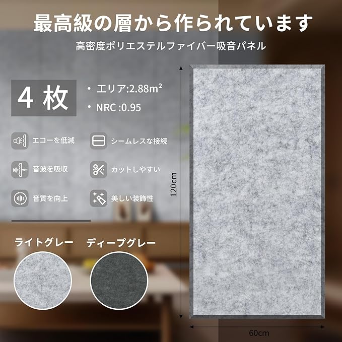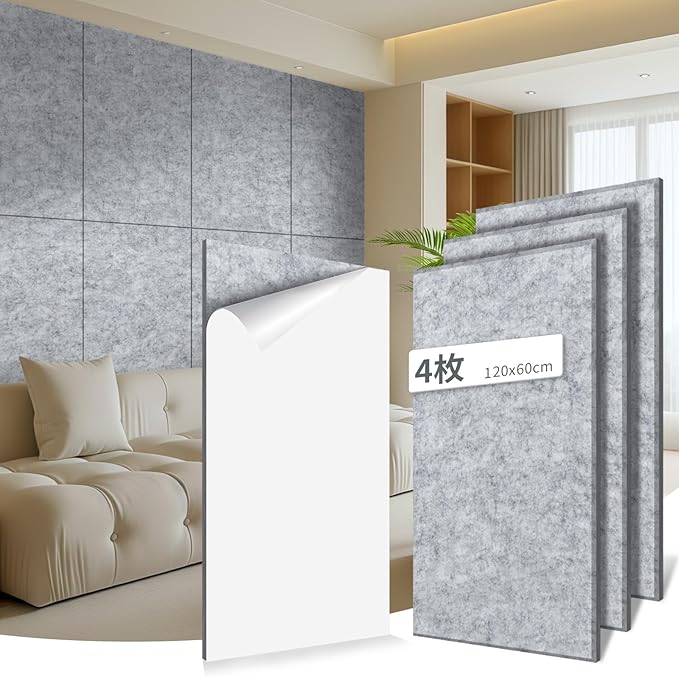 【貼るだけ施工】 高密度PET 吸音パネル 防音ボード 4枚セット 120 60cm 賃貸対応 防撞 衝撃吸収 幼稚園 保育園 児童館 ウォールパネル 遮音 きゅうおん材 防音材 オフィス 音楽スタジオ 寝室 書斎 ホームシアター 壁用 吸音材 防音パネル 簡単DIY 施工面積2.88㎡ ライトグレー | KAZESHOP