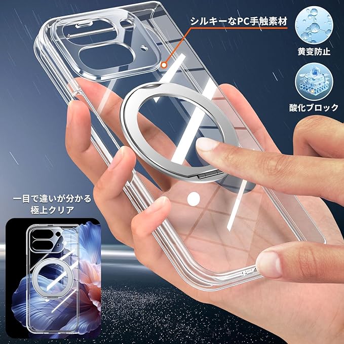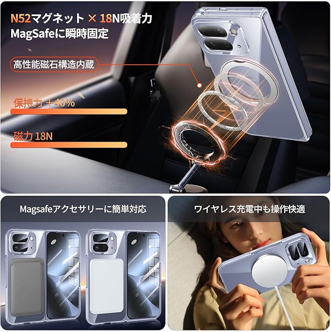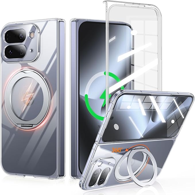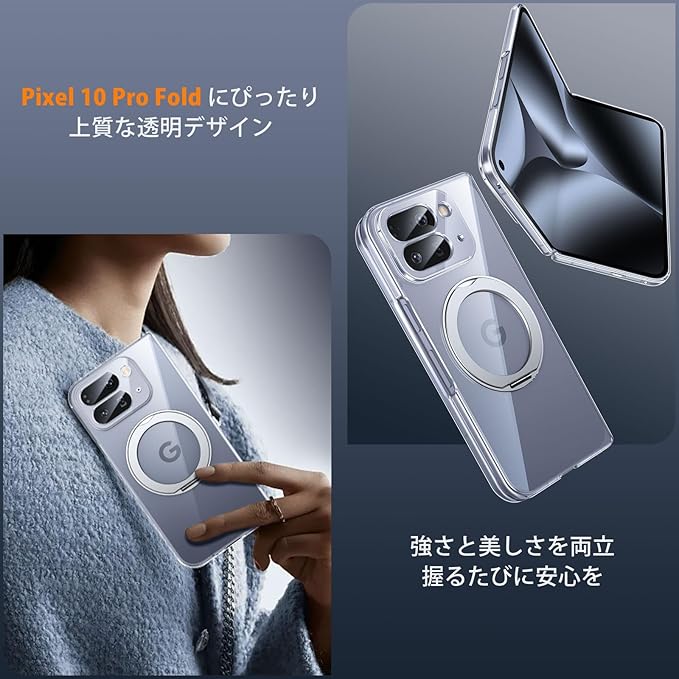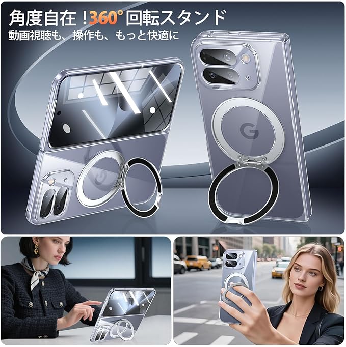Google Pixel 10 Pro Fold 用 ケース クリア MagSafe対応 360 回転スタンド フィルム一体型 Fadkzyxr スマホケース グーグル ピクセル 10プロ フォールド カバー リング付き レンズ保護 黄ばみ防止 マグセーフ ワイヤレス充電対応 透明 耐衝撃 ストラップホール付き-クリア | KAZESHOP