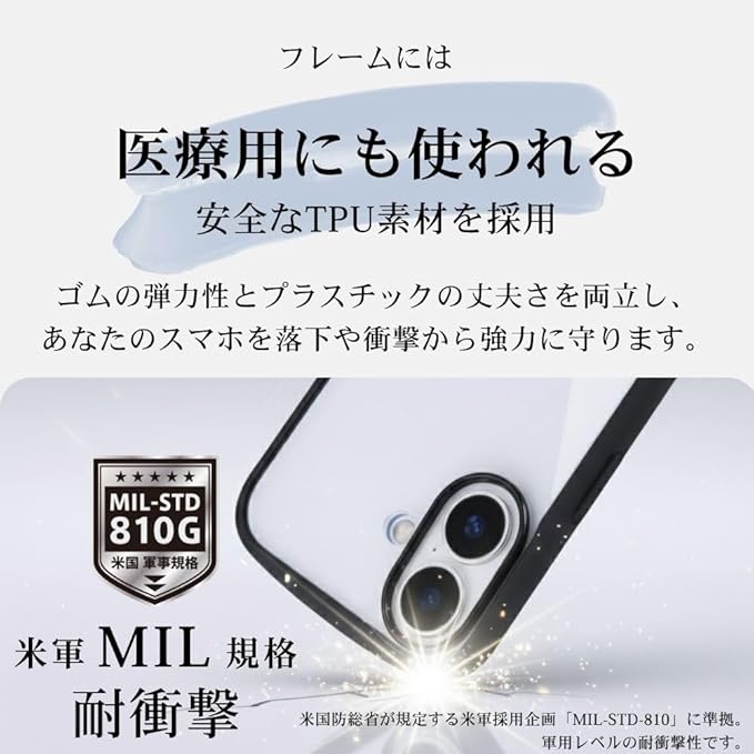 衝撃に強く、フィット感にも優れたハイブリッドケース。 背面は傷に強いポリカーボネート、側面には厚みのあるTPU素材を使用し、安心感のある使い心地を実現しました。 カメラまわりには高さのあるリング設計を採用し、レンズへの接触を防ぎます。 アクセサリーの取り付けに便利なストラップホール付き。