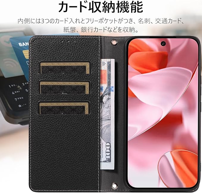 【カード収納機能&隠しマグネット設計】ピクセル9/ピクセル9pro/ピクセル10/ピクセル10pro用 ケース 手帳型の内側には3つのカード入れとフリーポケットがつき、名刺、交通カード、紙幣、銀行カードなどを収納、外出時はこのケースを携帯するだけで十分、日常の生活に便利です。マグネットが内蔵されているので、ベルトがなくても蓋がしっかりと閉まります。閉じたままスマートに通話可能。電源ボタン、音量ボタン等の機能が自然に使えます。