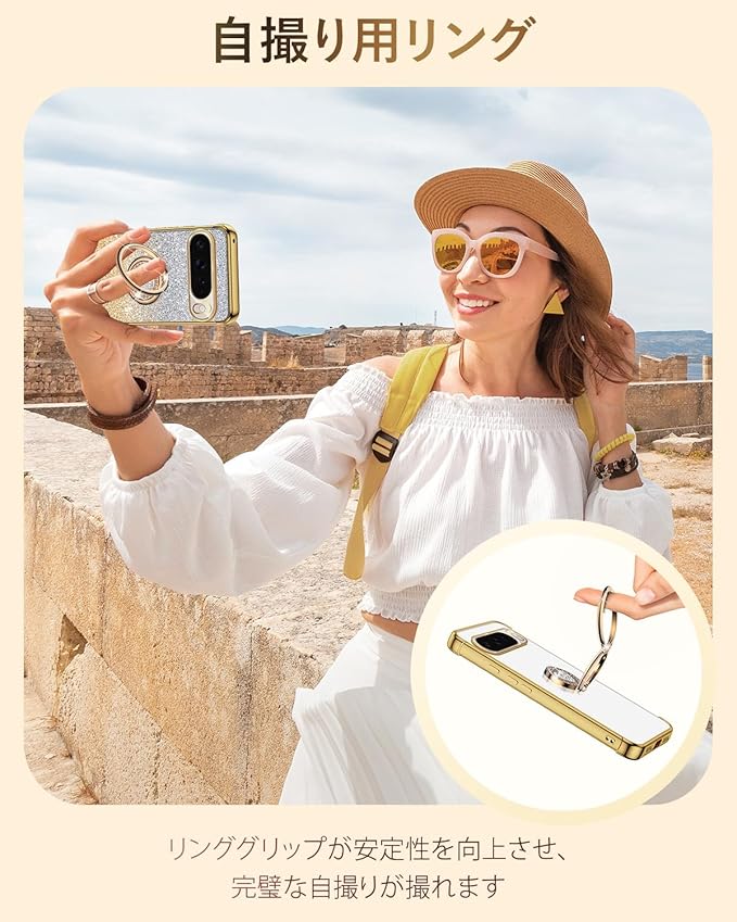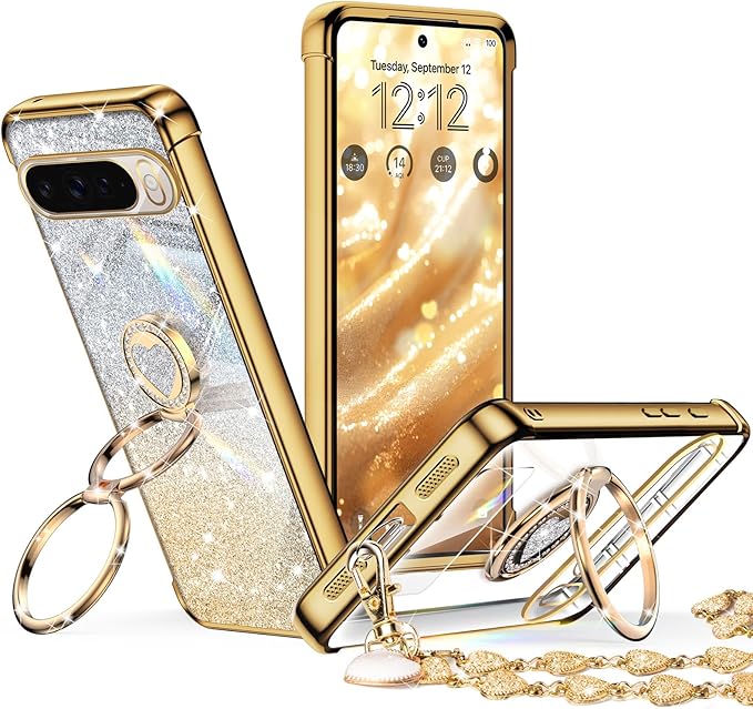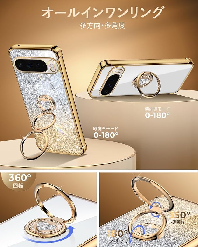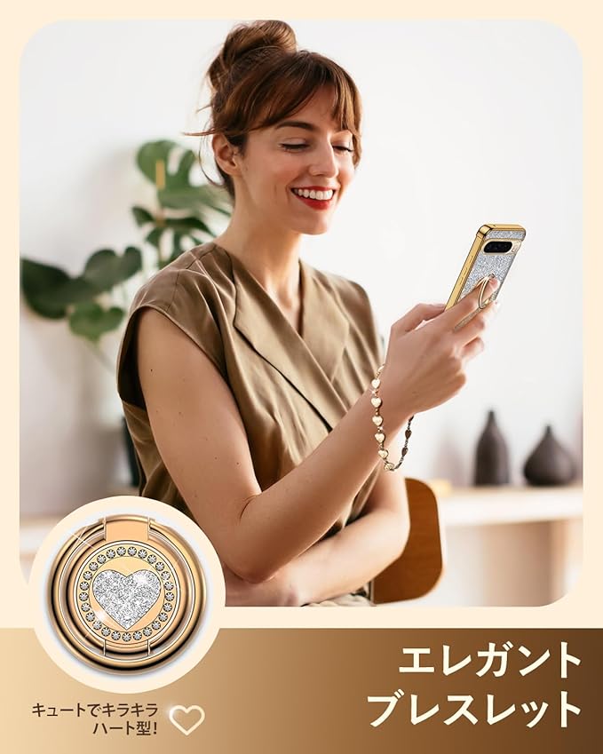 Rockaway 互換性 Pixel 10 用ケース ダブルリング付き リストバンド ブレスレット付き ストラップ 耐衝撃 薄型 軽量 紐付き キラキラ ラブハート かわいい 女の子 おしゃれ 豪華 スマホケース ピクセル10 用カバー - ゴールド | KAZESHOP