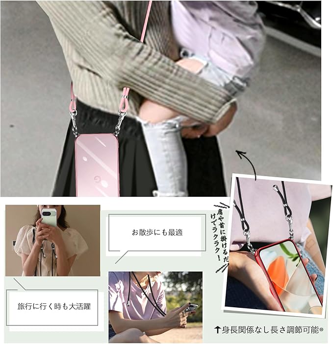 【ネックレスケース】シリコンケースには首から下げられるようにショルダーストラップが付いており、まるでアクセサリーのようにスマホを着用できます。落下防止はもちろん、紛失防止にも役立ちます。 特に旅行や、小さなお子様がいるお母さんにおすすめ、手荷物がある時にスマホを持ち続ける必要がなくなりますし、スマホを落としたり無くしたりといった心配もなくなります、バッグから携帯を取り出す手間がはぶけます。