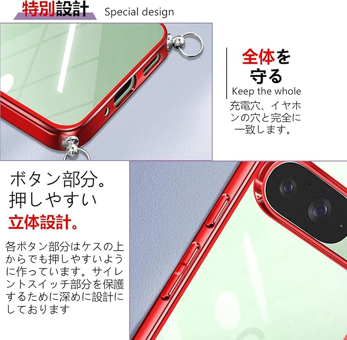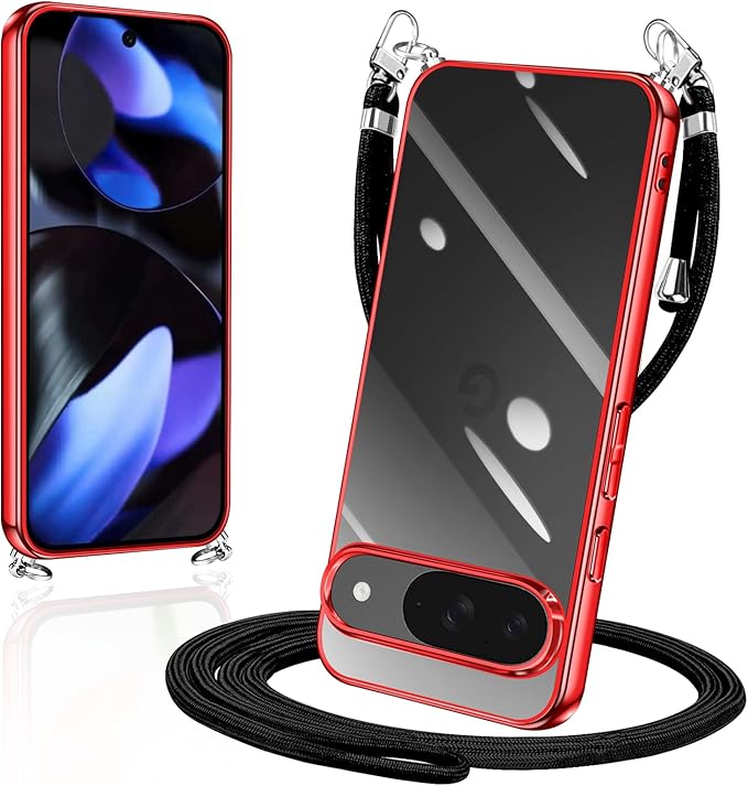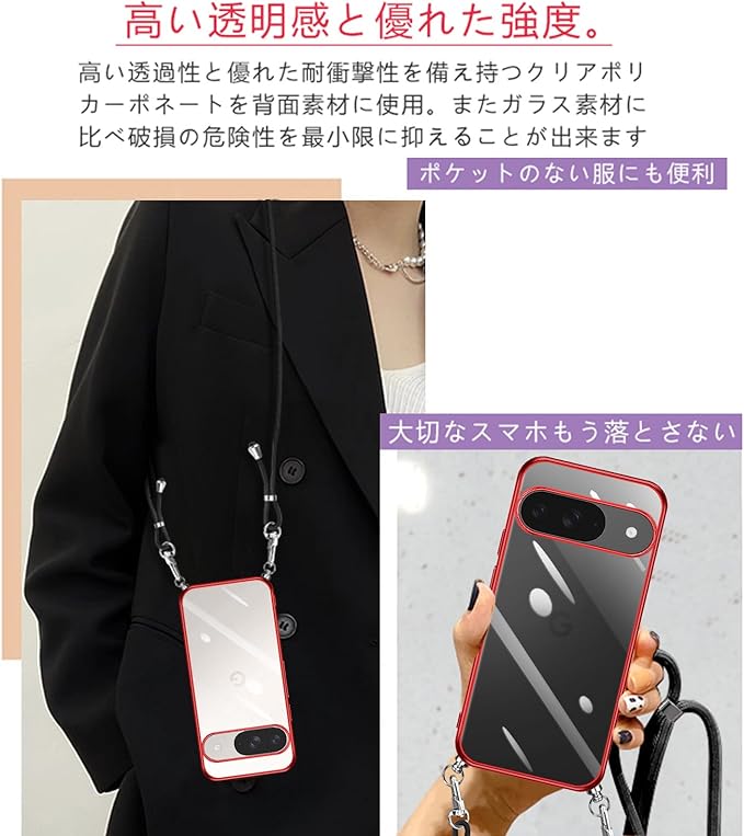Google Pixel10 / pixel 10 Pro ケース クリア ショルダー グーグル ピクセル10/10Pro スマホケース カバー 透明 TPU 薄型 肩掛け 首掛け 斜めかけケース 耐衝撃 シリコン(レッド) | KAZESHOP