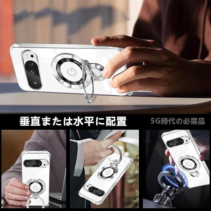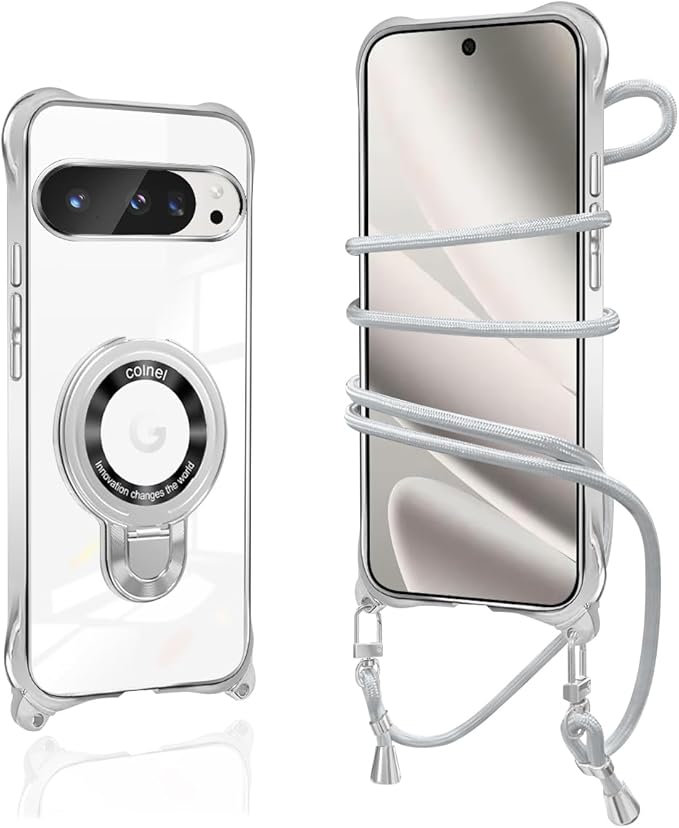 Google Pixel10 Pro XL ケース クリア ショルダー 透明 グーグルピクセル10 pro xl カバー リング付き pixel 10 pro xl カバー スタンド機能 マグネット搭載 耐衝撃 米軍規格 紐付き 斜めがけ 織りストラップ付き ネックストラップ ショルダー 縦/横 2WAY 長さ調整可能 取り外し可能 落下防止 紛失防止(シルバー) | KAZESHOP