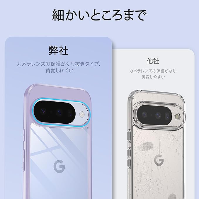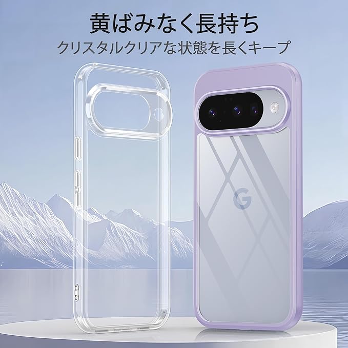 【透明感漂う・黄変にくい】背面は高透明度と指紋軽減を両立したポリカーボネート素材を採用、光透過率は99%、透き通った高い透明度を誇り、ピクセル10/10pro本来の美しさをそのままに楽しめます。高精度表面処理また最新の黄変防止技術を使用することで、pixel10/10proケースを長時間使用しても鮮明で透明性を保ち、日常使用時の指紋や油汚れなどによる損失を軽減することができます。いつものスマホに上品さをプラス。