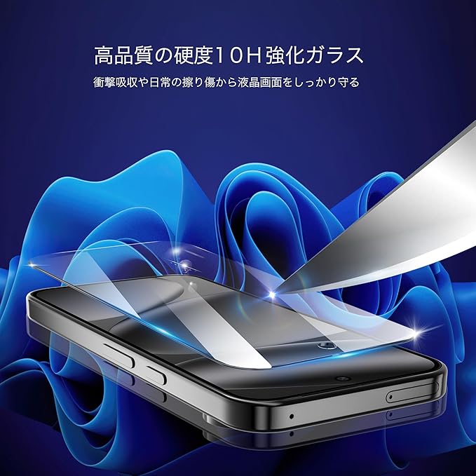 特徴 強化ガラス素材、10H 表面硬度 、擦り傷防止、衝撃吸収、 撮影影響なし 、剥がれにくい 、一体感抜群 、貼り付け簡単