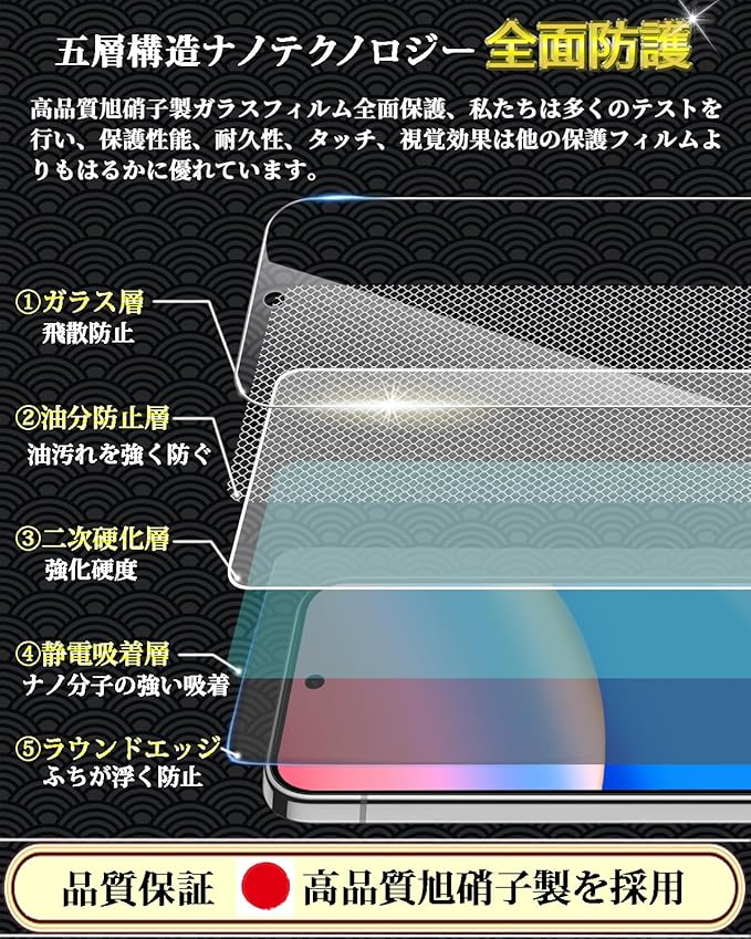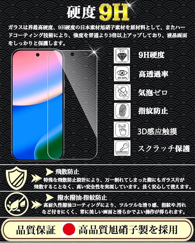 【表面硬度9H!飛散防止】日本製素材旭硝子製を採用しております、高品質な素材で衝撃を緩和し画面の破損を最低限まで抑えます。9H硬度で、ハードコーティング技術により、衝撃を緩和し画面の破損を最低限まで抑え、すり傷や指紋からもスクリーンをしっかりと保護します。