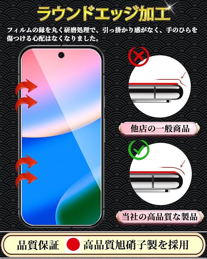特徴 全面保護,9H表面硬度,飛散防止,防指紋,撥油コーティング,撥水剤,耐衝撃性,ラウンドエッジ,気泡なし,高透過率,簡単貼り付け