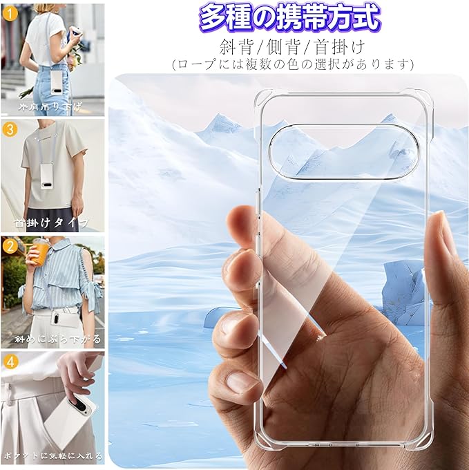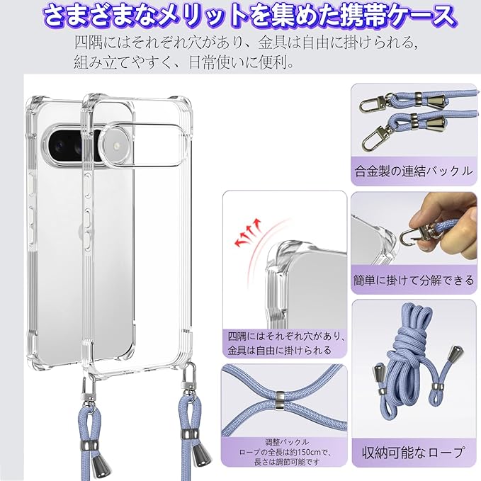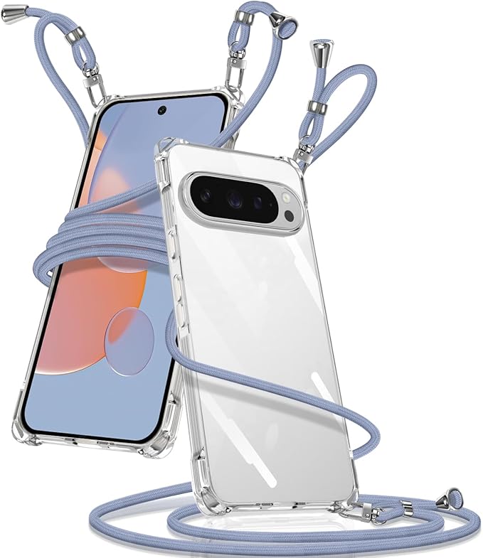 Google Pixel 10/Pixel 10 Pro 用 ケース クリア ショルダー ピクセル10 カバー 肩掛け 斜めかけ 縄掛けケース 透明 薄型 軽量 TPU 携帯ケース 紐付き 織りストラップ付き 長さ調整可能 取り外し可能 落下防止 紛失防止(グレーブルー) | KAZESHOP