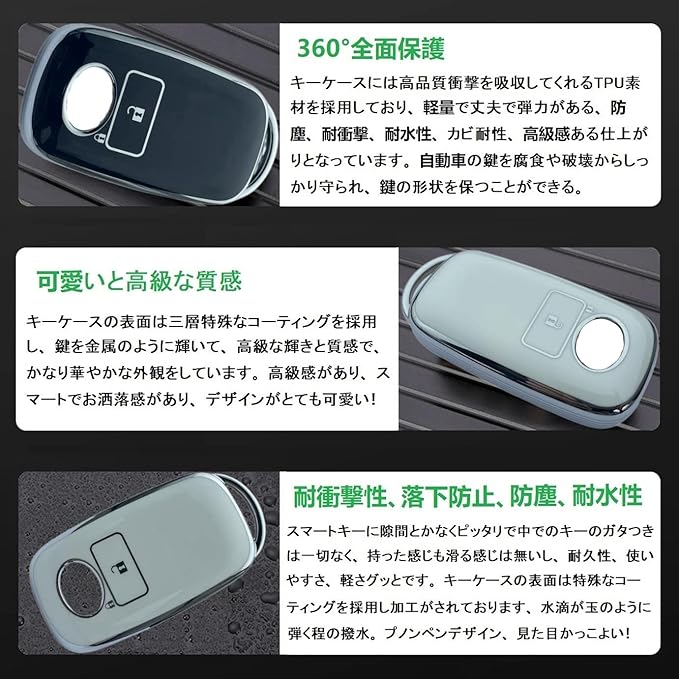【360 全面保護】キーケースには高品質衝撃を吸収してくれるTPU素材を採用しており、軽量で丈夫で弾力がある、防塵、耐衝撃、耐水性、着地緩衝の効果があります。キーケースの表面は特殊なコーティングを採用し加工がされております、水滴が玉のように弾く程の撥水、自動車の鍵を腐食や破壊からしっかり守られ。360 全面保護、するため 落としてもキーに 傷がつくことはありません。