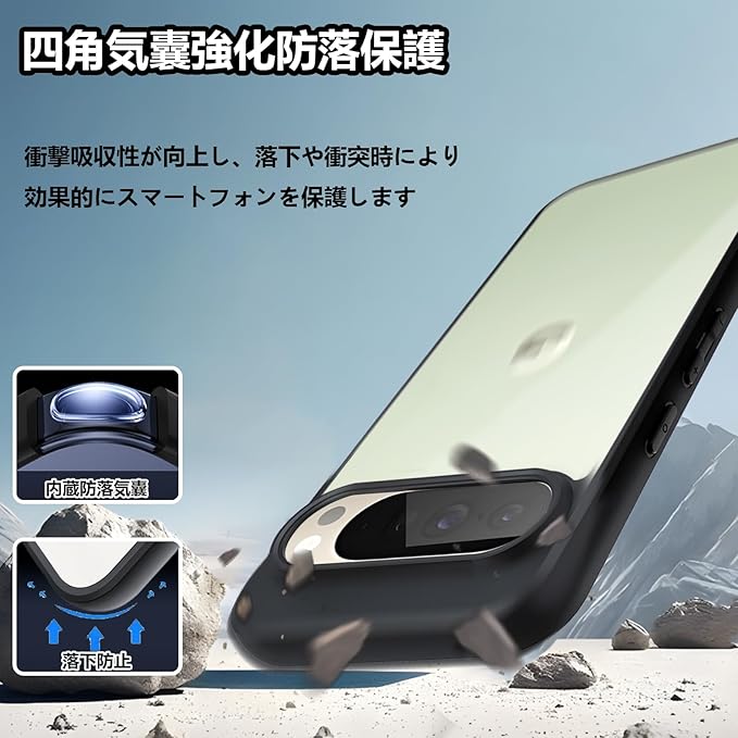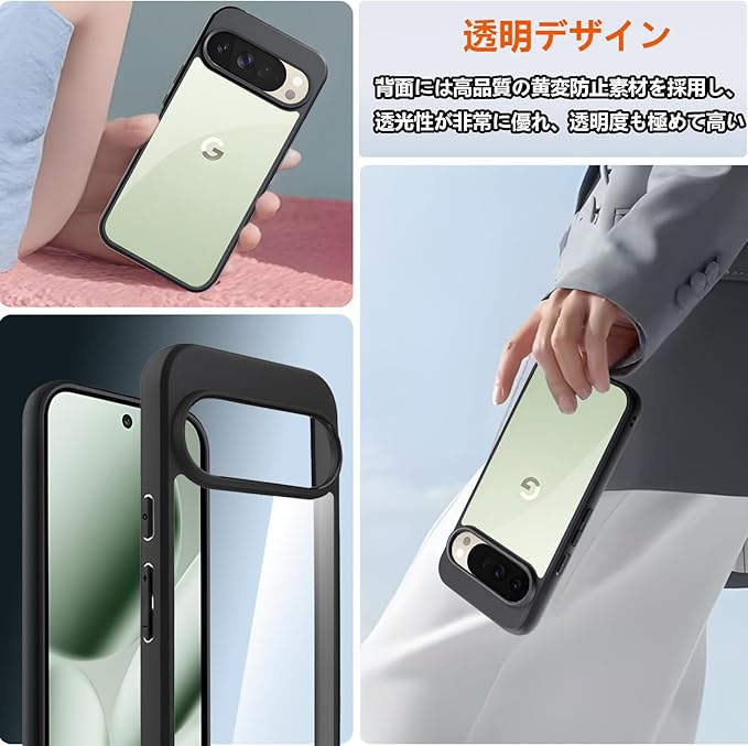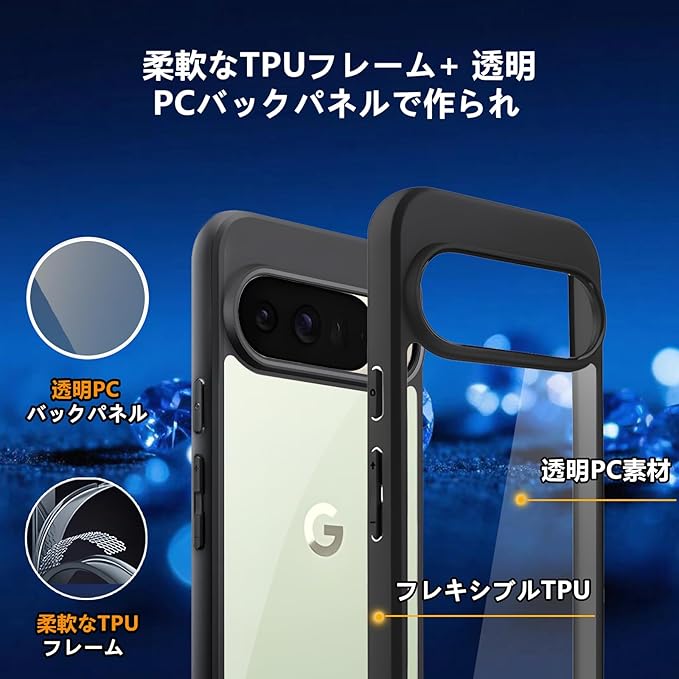 【高品質PC+TPU素材】ピクセル10 pro XLケース透明頑丈PC背面+ 黒色柔らかいTPUの組み合わせ、四隅の内側のエアクッションが衝撃を吸収します を全方位に保護する非常に高い耐衝撃性を持っています,ソフトとハードの間くらいの硬さで丁度いい感じです。つけたり取ったりしやすい。ストラップホールがあります