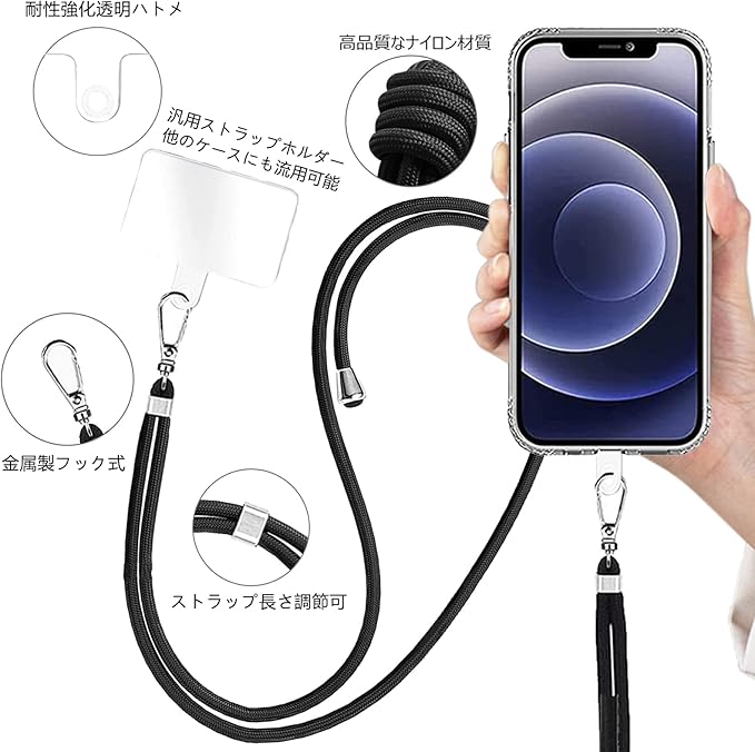 【実用性1:取付簡単の組合せ】:機種専用の透明カバー&ストラップホルダーのシート&ロングストラップというセットで3n1同梱販売のです。ホルダーシートをカバーの中に入れて、充電口からハトメを出した上に、端末をカバーに取り付けたら完成!着脱が超簡単ですよ。