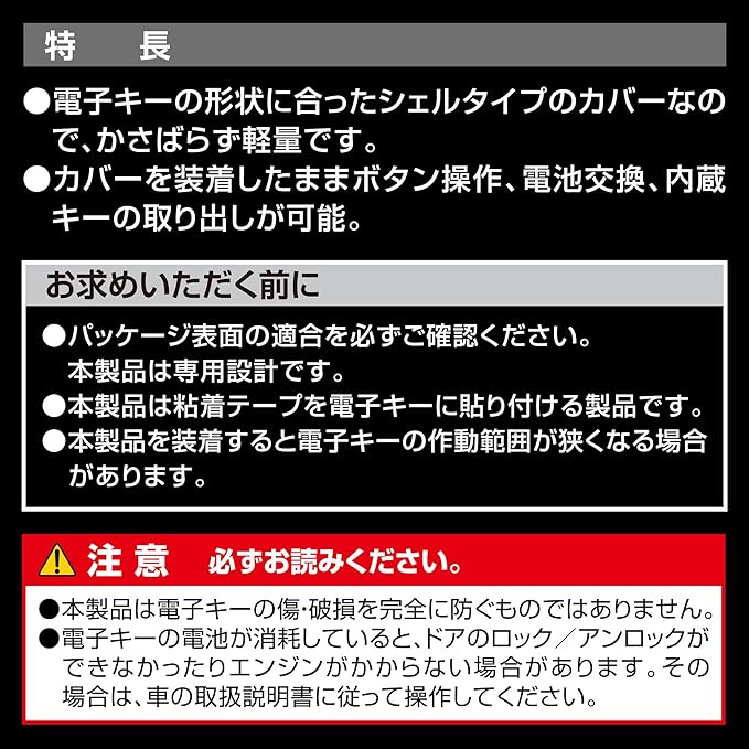 ・本製品を装着すると、使用条件によっては電子キーの作動範囲が狭くなる場合があります。