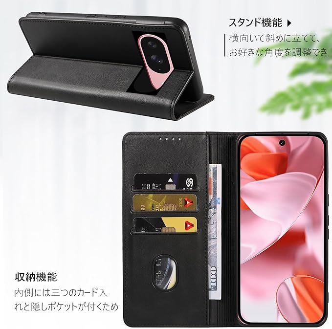 【多用機能】このpixel 9pro 用スマホケースは横置きのスタンド機能が付いて、好きな角度を調整して動画鑑賞や読書などを楽しめます。pixel 9 用 カバーの内側に3つのカードポケットと1つの隠しポケットがあり、カードや小銭などを入れることが可能です。お気に入りの写真がよく見えるように特別にデザインされた透明な窓。