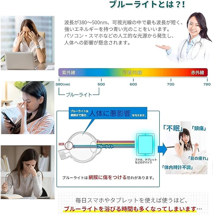 【ブルーライトカット】:ブルーライトと紫光を浴び続けると人体に非常に有害です。例えば、「疲れ目」「視力低下」「睡眠の質が低下」「頭痛」を引き起こし、体全体に悪影響を与えます。保護フィルムにブルーライト遮断層を追加して、波長400〜450ナノメートルのブルーライトを遮断します(90%)。画面を長時間見ている疲労を軽減できます