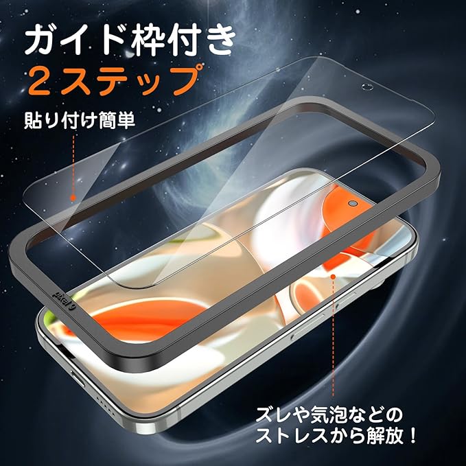 【貼り付け簡単&ガイド枠付き】 2ステップだけで、初心者として完璧に貼り付け!画面に置くだけでキレイに貼れ、気泡も抜けやすい。CNC彫刻加工を採用されたガイド枠はPixel 9 Pro XLの画面にぴったりして、ズレなどのストレスから解放!