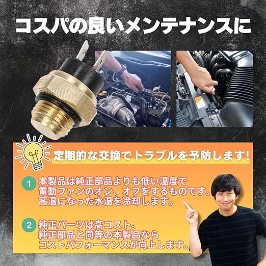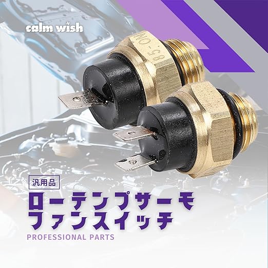 【エンジン保護と冷却効率】ラジエーターのロワタンクや冷却水通路に取り付けられるこのサーモスイッチは、電動ファンのオン・オフを設定温度で制御し、エンジンの過熱を防ぎ、エンジンブローを回避します。サーモファンスイッチが故障すると、冷却水の温度が上昇し、オーバーヒートやヘッドガスケット抜けなどの故障原因となるため、適切な機能が非常に重要です。