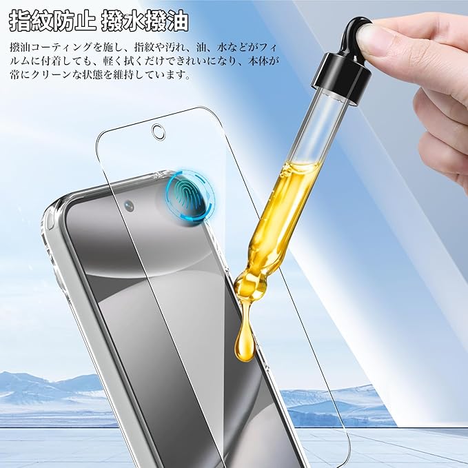 【汚れに強い】撥水・撥油加工が指紋や皮脂の付着を防ぎます。フィルムの表面には様々な特殊加工が施されており、油分、ほこり、指紋に強く、スマートフォンを常に清潔な状態に保ち、見た目の美しさや画面体験にも影響を与えません。頻繁にスマホを拭かないようにします。