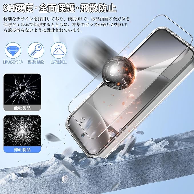 【ガラスフィルム付きの心配りある保護】日本製旭硝子材料を採用し、外部からの沖撃に強く、スマートフォンの画面への沖撃を防ぎます。また、特殊な飛散防止設計により、フィルムが割れても飛散せず、高い安全性を実現しています。スマートフォンを全面的に保護し、液晶画面の安全を守り、長く安心してお使いいただけます。