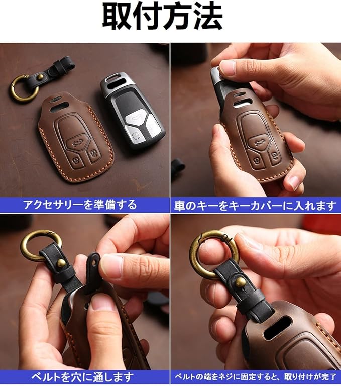 【キーカバーしたまま “ ボタン操作 “ 】 ボタンの形状を型押しすることで、スマートキーに “ 装着したままボタン操作できる “ よう仕上げております。わざわざカバーを外す必要はありません。【取付簡単】装着方法 : キーケースに本体を入れ、ベルトを通うします、金属固定部にベルトを取り付けます。取り付けは簡単で専用設計なのでしっかりフィットします。