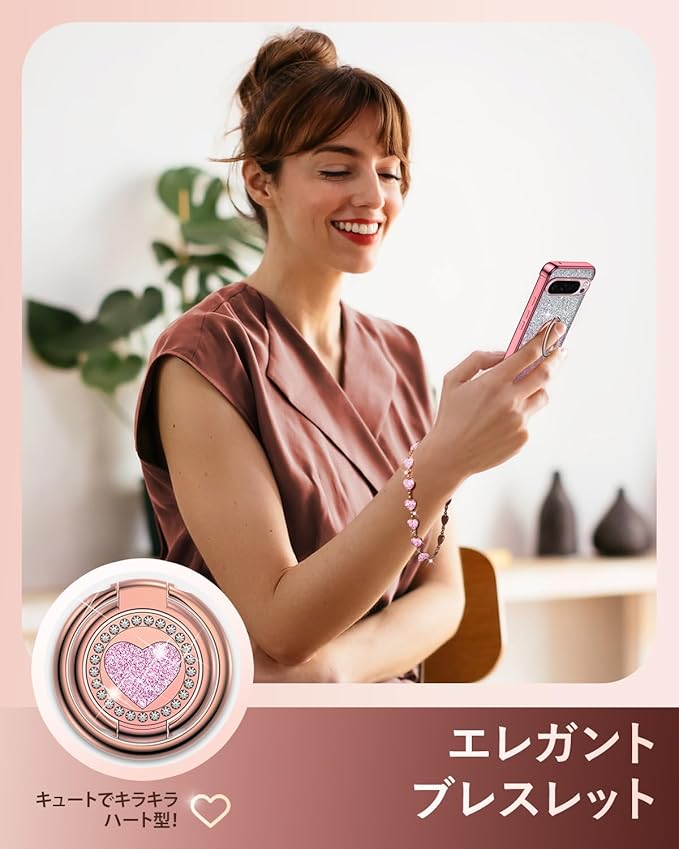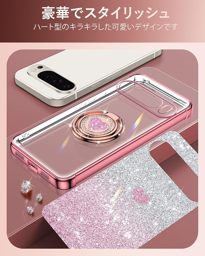 Rockaway 互換性 Pixel 10 Pro用 ケース ダブルリング付き リストバンド ブレスレット付き ストラップ 耐衝撃 薄型 軽量 紐付き キラキラ ラブハート かわいい 女の子 おしゃれ 豪華 スマホケース ピクセル10プロ 用カバー - ローズゴールド | KAZESHOP