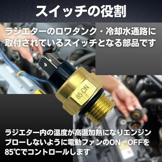 85℃ロー添付サーモファンスイッチM16-P1.5汎用社外品です ラジエターのロワタンク・冷却水通路に取付されているスイッチとなる部品です ラジエター内の温度が高温過熱になりエンジンブローしないように、電動ファンのON・OFFを設定温度でコントロールする役割があります