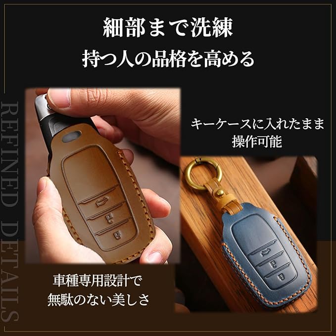 【商品概要】 トヨタ向けの牛本革のスマートキー専用キーケースです。車種専用設計で本体にぴったりフィットします。ボタンの位置に刻印がついており、操作を誤ることなくスムーズに操作可能です。高品質な牛革を採用し、職人により一つひとつ手作りで仕上げた逸品です。