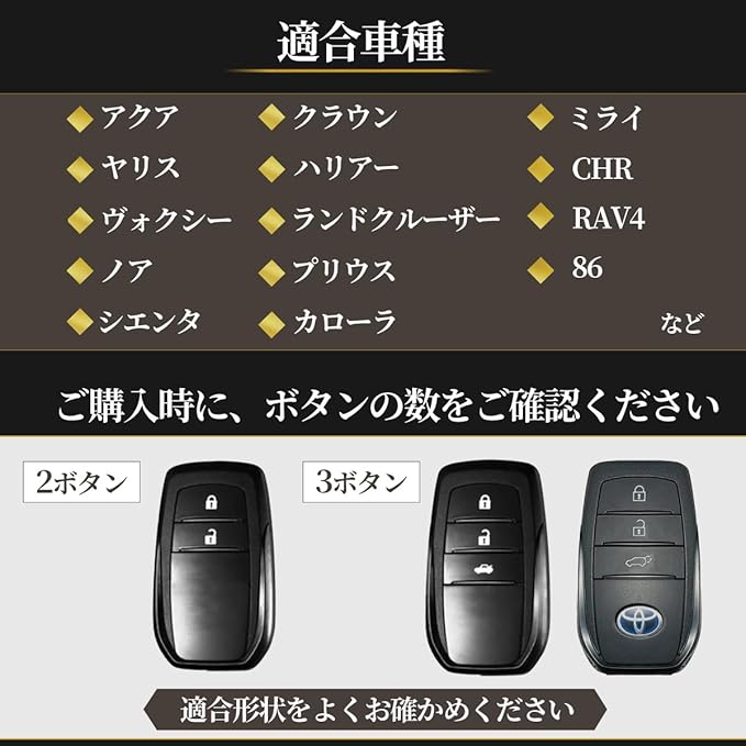 【適合車種】 ランドクルーザー200系 / ランドクルーザー300系 / ヤリス クロス / カローラ クロス / 新型ハリアー 80系 MXUA80 / MXUA85 / AXUH80 / AXUH85 / ハイラックス GUN125 / トヨタ ミライ MIRAI / MARK X マークX 250G Sパッケージ / 新型 ランクル300系 / ランクル250系 / クラウン クロスオーバー / 新型クラウン (Crown Crossover) / ヤリス(YARIS) / GRヤリス / 新型アクア Aqua MXPK10系 / カローラスポーツ corolla sport / 新型カローラ / カローラツーリング 17系・215系・219系 / 新型プリウス(PRIUS) 60系 65系等、スマートキー形状が一致する商品であれば適応可能です。 ※グレードや年式によっては適合しない場合がございますので、お使いのスマートキー形状を必ずご確認くださいませ。(商品画像ご参照)